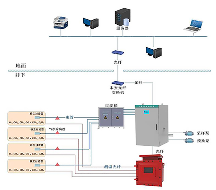 全激光礦井火災(zāi)預(yù)警系統(tǒng)是我公司研發(fā)而成的新一代煤礦火災(zāi)預(yù)防預(yù)報(bào)系統(tǒng)。本系統(tǒng)采用激光光譜技術(shù)(TDLAS)結(jié)合先進(jìn)的激光光纖測(cè)溫技術(shù)(DTS),可以對(duì)井下火災(zāi)報(bào)警要求的7種氣體實(shí)時(shí)在線監(jiān)控,國(guó)內(nèi)首次實(shí)現(xiàn)了對(duì)所有氣體的全組分激光技術(shù)監(jiān)測(cè);對(duì)井下溫度分布式多點(diǎn)監(jiān)控,實(shí)現(xiàn)對(duì)煤礦火災(zāi)的預(yù)警預(yù)報(bào),是煤礦火災(zāi)預(yù)防預(yù)報(bào)的新一代解決方案。