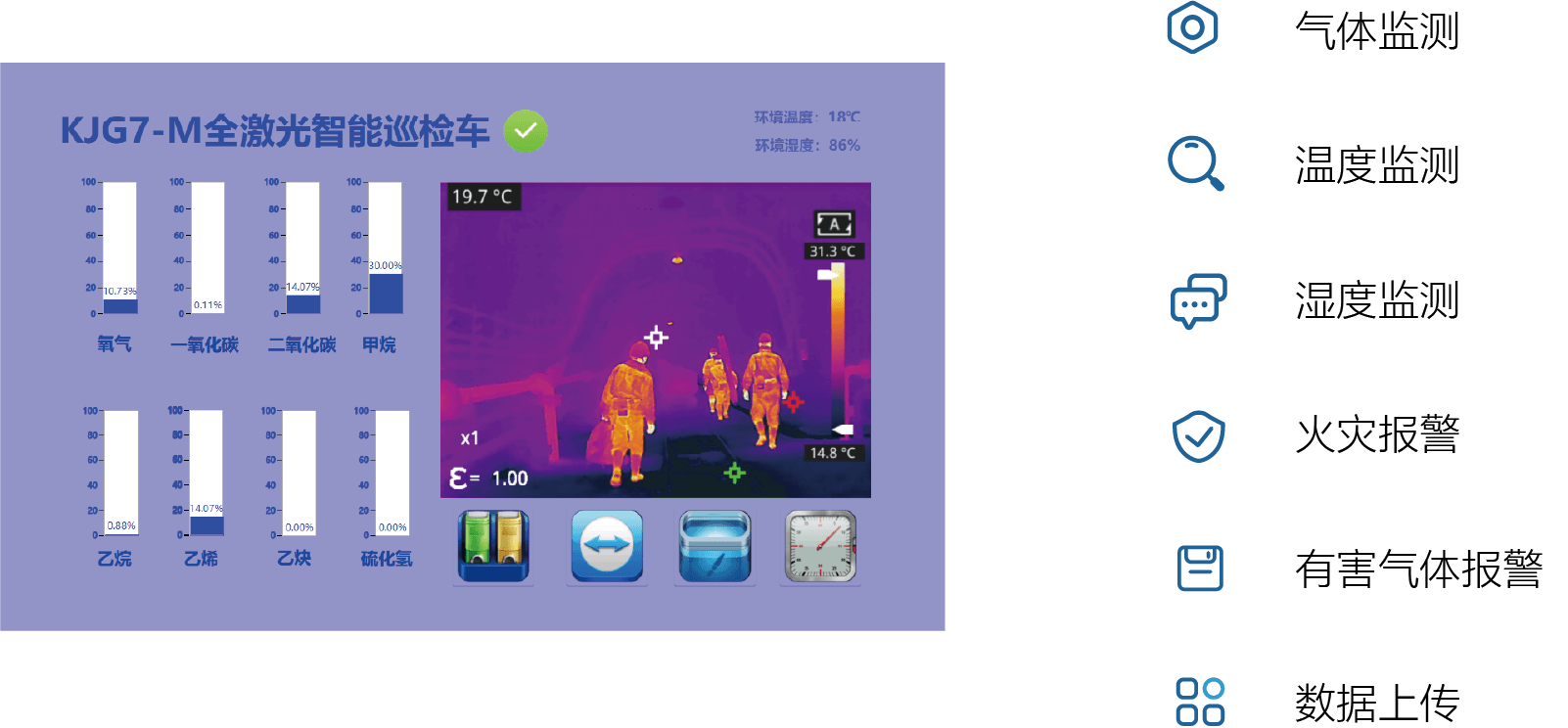全激光智能巡檢車,是基于華光公司核心技術(shù)----中紅外QCL激光光譜分析技術(shù)為煤礦定制開(kāi)發(fā)的一款產(chǎn)品,可以對(duì)井下火災(zāi)報(bào)警要求的7種氣體巡航實(shí)時(shí)監(jiān)測(cè),是煤礦火災(zāi)預(yù)防預(yù)報(bào)的新一代解決方案。